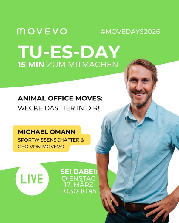 Michael Omann führt euch durch eine lustige, energiegeladene Bewegungseinheit fürs Büro. Mit tierisch inspirierten Moves bringt ihr Schwung in den Arbeitsalltag, lockert den Körper – und startet danach spürbar frischer in den Tag. Nicht nur für das Büro geeignet!